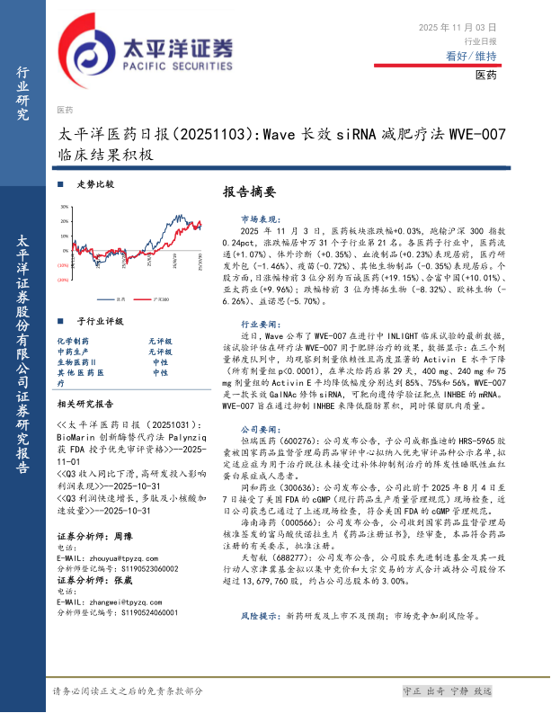 医药日报:Wave长效siRNA减肥疗法WVE-007临床结果积极