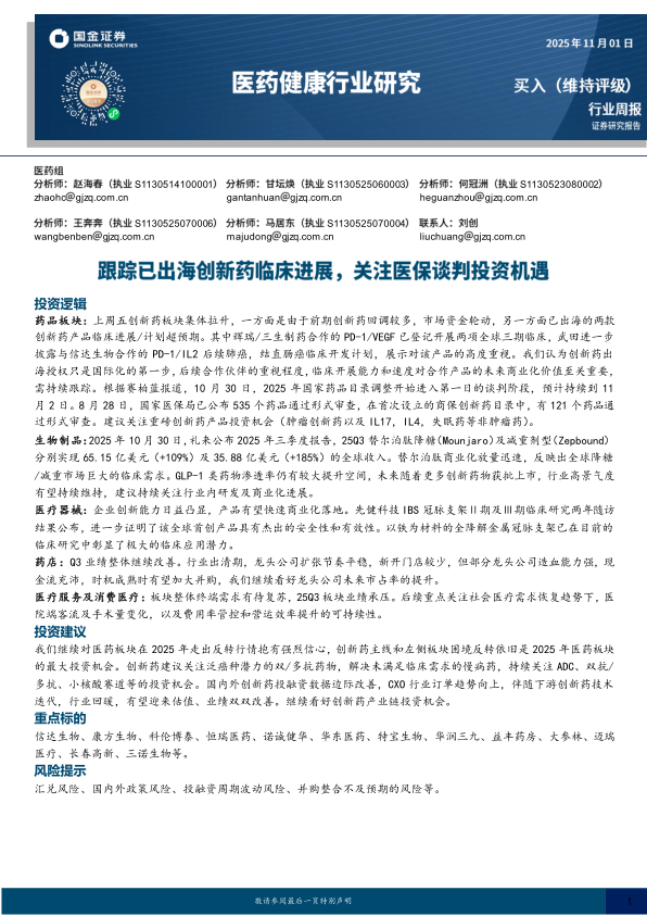 医药健康行业研究:跟踪已出海创新药临床进展,关注医保谈判投资机遇