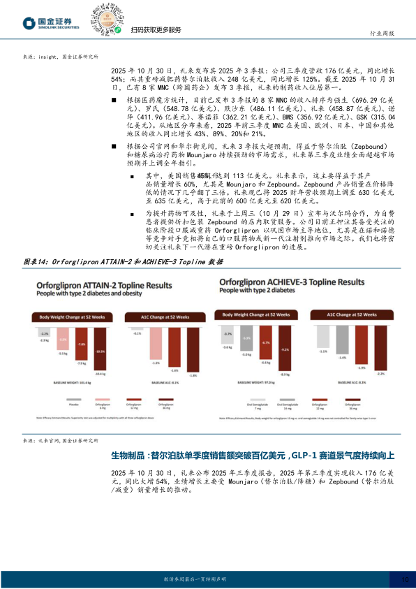 生物制品:2025年10月30日,礼来公布2025年三季度报告,25Q3替尔泊肽降糖(Mounjaro)及减重剂型(Zepbound)分别实现65.15亿美元(+109%)及35.88亿美元(+185%)的全球收入。替尔泊肽商业化放量迅速,反映出全球降糖/减重市场巨大的临床需求。GLP-1类药物渗透率仍有较大提升空间,未来随着更多创新药物获批上市,行业高景气度有望持续维持,建议持续关注行业内研发及商业化进展。