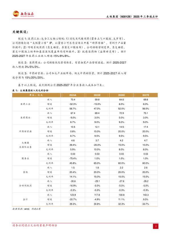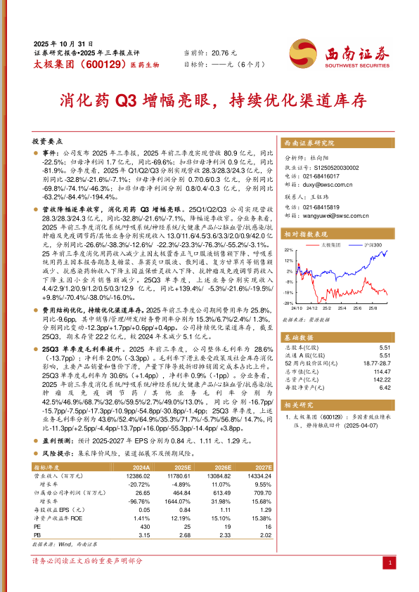 营收降幅逐季收窄,消化用药Q3增幅亮眼。25Q1/Q2/Q3公司实现营收28.3/28.3/24.3亿元,同比-32.8%/-21.6%/-7.1%,降幅逐季收窄。分业务来看,2025年前三季度消化系统/呼吸系统/神经系统/大健康产品/心脑血管/抗感染/抗肿瘤及免疫调节药/其他业务分别实现收入13.0/11.6/4.5/3.6/3.3/2.0/0.9/42.0亿元,分别同比-26.6%/-38.3%/-12.6%/-22.3%/-23.3%/-76.3%/-55.2%/-3.1%。25年前三季度消化用药收入减少主因太极藿香正气口服液销售额下降、呼吸系统用药主因本报告期急支糖浆、鼻窦炎口服液、散列通、复方甘草片等销售额减少、抗感染药物收入下降主因益保世灵收入下降、抗肿瘤及免疫调节药收入下降主因小金片销售额减少。25Q3单季度,上述业务分别实现收入4.4/2.9/1.2/0.9/1.2/0.5/0.3/12.9亿元,同比+139.4%/-5.3%/-21.6%/-19.5%/+9.8%/-70.4%/-38.0%/-16.0%。