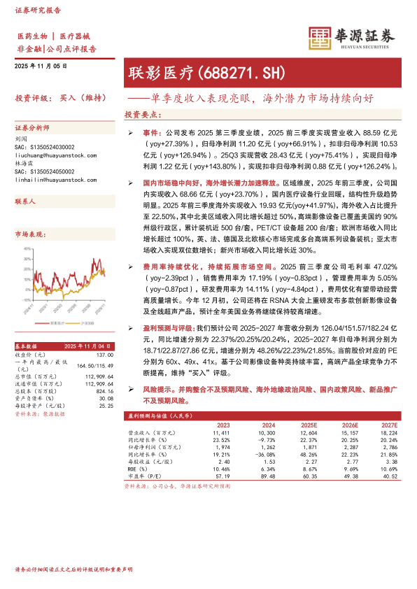盈利预测与评级:我们预计公司2025-2027年营收分别为126.04/151.57/182.24亿元,同比增速分别为22.37%/20.25%/20.24%,2025-2027年归母净利润分别为18.71/22.87/27.86亿元,增速分别为48.26%/22.23%/21.85%。当前股价对应的PE分别为60x、49x、41x。基于公司影像设备种类持续丰富,高端产品全球竞争力不断提高,维持“买入”评级。
