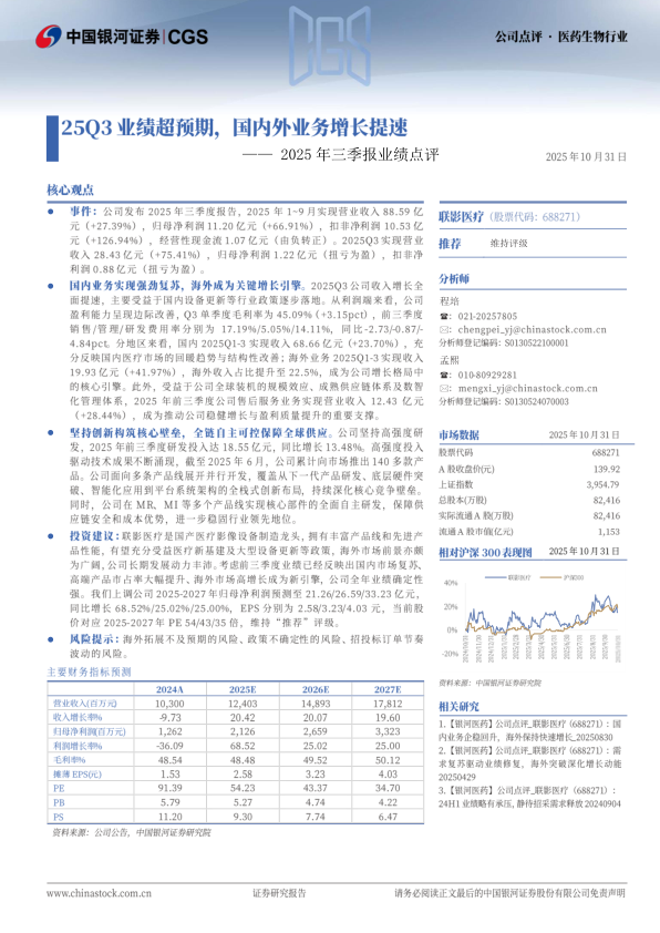 投资建议:联影医疗是国产医疗影像设备制造龙头,拥有丰富产品线和先进产品性能,有望充分受益医疗新基建及大型设备更新等政策,海外市场前景亦颇为广阔,公司长期发展动力丰沛。考虑前三季度业绩已经反映出国内市场复苏、高端产品市占率大幅提升、海外市场高增长成为新引擎,公司全年业绩确定性强。我们上调公司2025-2027年归母净利润预测至21.26/26.59/33.23亿元,同比增长68.52%/25.02%/25.00%,EPS分别为2.58/3.23/4.03元,当前股价对应2025-2027年PE 54/43/35倍,维持“推荐”评级。