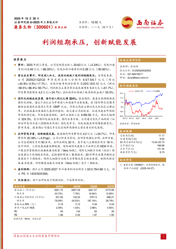 国际化战略成效显著,海外收入同比大增 324%。 报告期内,康泰生物持续推进国际化战略,通过产品认证与市场准入加速海外业务拓展。其 13价肺炎球菌多糖结合疫苗先后获得土耳其 GMP 认证、印度尼西亚注册证及尼加拉瓜注册证书; 水痘减毒活疫苗在巴基斯坦获批,标志着公司在欧亚、拉美及南亚市场的布局取得突破。年初至报告期末, 海外业务收入达 4189.56 万元,同比大幅增长 324.3%,显示国际化成效显著。国内业务方面,公司通过优化产品结构(如部分研发项目进入Ⅲ期临床阶段)强化竞争力,但未披露具体销售数据变化。整体来看,报告期公司通过多元化区域布局推动主营业务全球化进程。