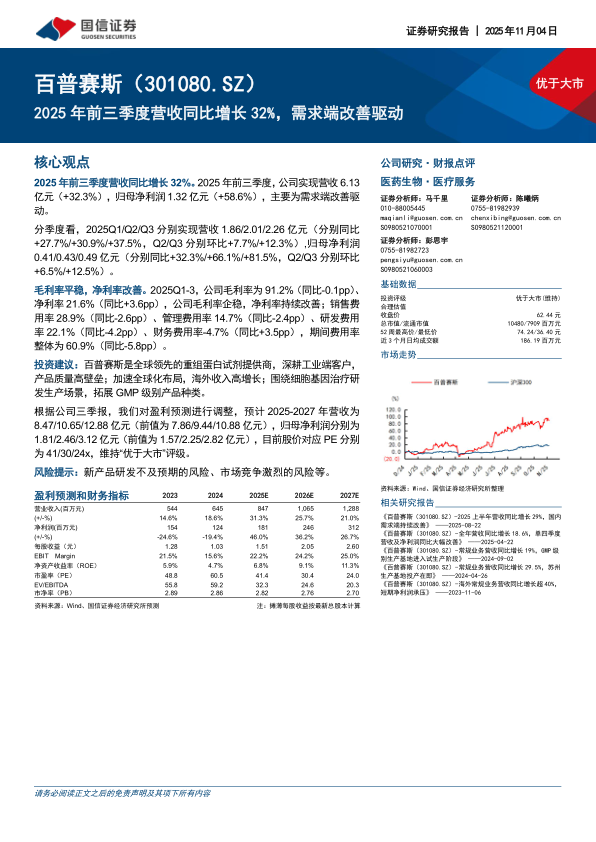 投资建议:百普赛斯是全球领先的重组蛋白试剂提供商,深耕工业端客户,产品质量高壁垒;加速全球化布局,海外收入高增长;围绕细胞基因治疗研发生产场景,拓展GMP级别产品种类。