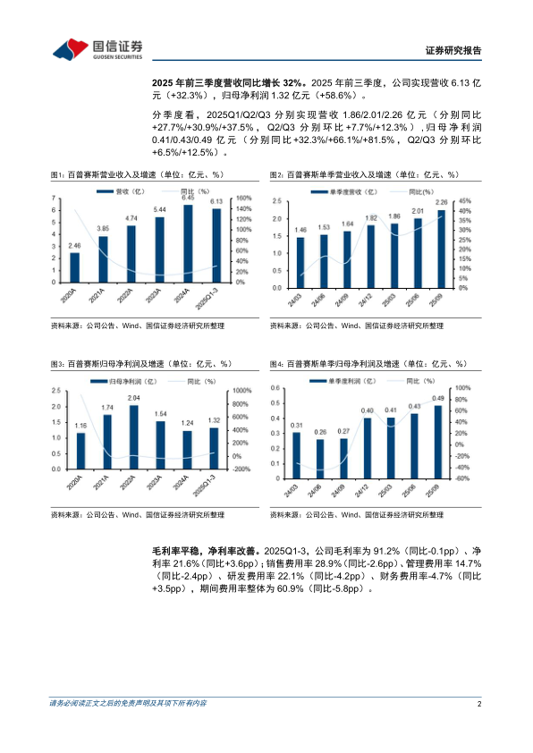 分季度看,2025Q1/Q2/Q3分别实现营收1.86/2.01/2.26亿元(分别同比+27.7%/+30.9%/+37.5%,Q2/Q3分别环比+7.7%/+12.3%),归母净利润0.41/0.43/0.49亿元(分别同比+32.3%/+66.1%/+81.5%,Q2/Q3分别环比+6.5%/+12.5%)。