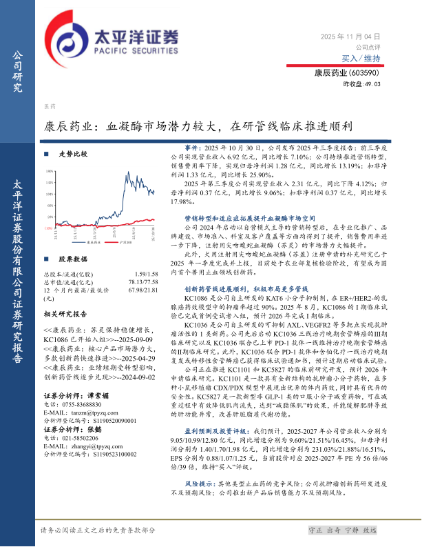 公司正在推进KC1101和KC5827的临床前研究开发,预计2026年申请临床研究。KC1101是一款具有全新结构的抗肿瘤小分子药物,在多种小鼠移植瘤CDX/PDX模型中展现出优异的体内药效,同时具有优异的安全性。KC5827是一款新型非GLP-1类的口服小分子减重药物,可在减重过程中有效降低肌肉流失,达到“减脂保肌”的效果,并能缓解肥胖导致的肝功能异常,改善肝脏脂质代谢功能。