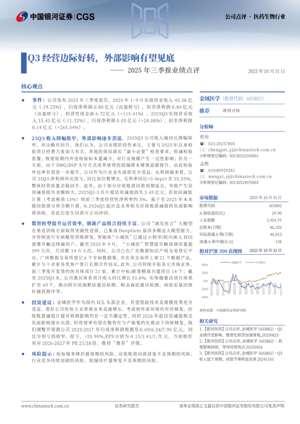 投资建议:金域医学作为国内ICL头部企业,有望借助技术及规模优势充分受益,看好公司医检主业常规业务高速增长。考虑到外部环境仍有待修复,以及应收账款减值计提对利润影响仍有一定不确定性,我们调整并预测公司2025-2027年归母净利润预测至-0.69/6.54/7.90亿元,同比分别亏损收窄、扭亏、20.90%,EPS分别为-0.15/1.41/1.71元,当前股价对应2026-2027年PE21/18倍,维持“推荐”评级。