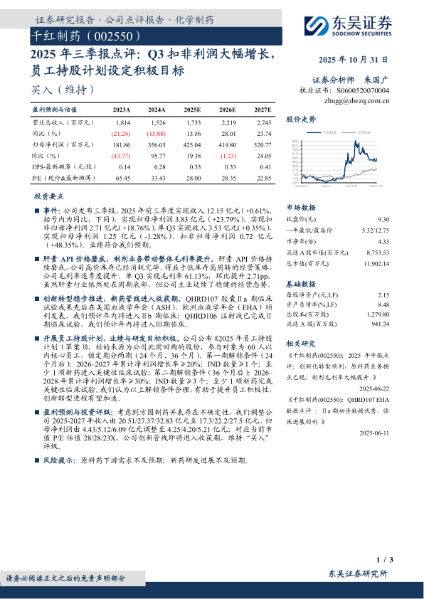 盈利预测与投资评级:考虑到方圆制药并表存在不确定性,我们调整公司2025-2027年收入由20.51/27.37/32.83亿元至17.3/22.2/27.5亿元,归母净利润由4.43/5.12/6.09亿元调整至4.25/4.20/5.21亿元;对应当前市值P/E估值28/28/23X,公司创新管线即将进入收获期,维持“买入”评级。