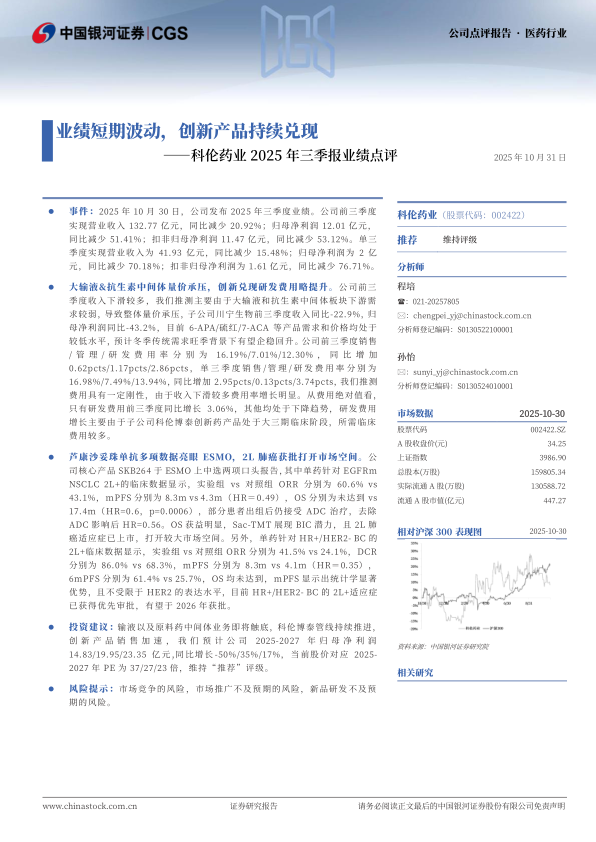 科伦药业2025年三季报业绩点评:业绩短期波动,创新产品持续兑现