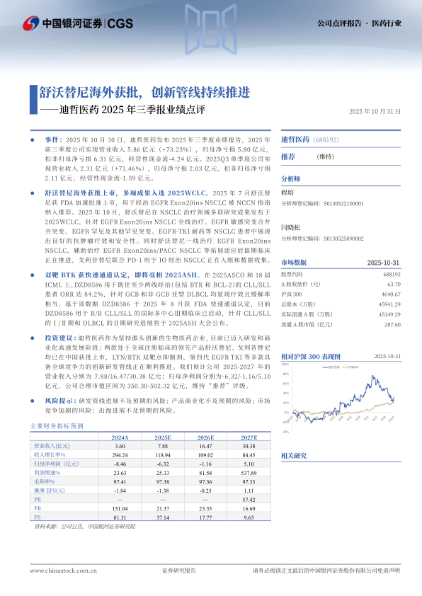 迪哲医药2025年三季报业绩点评:舒沃替尼海外获批,创新管线持续推进