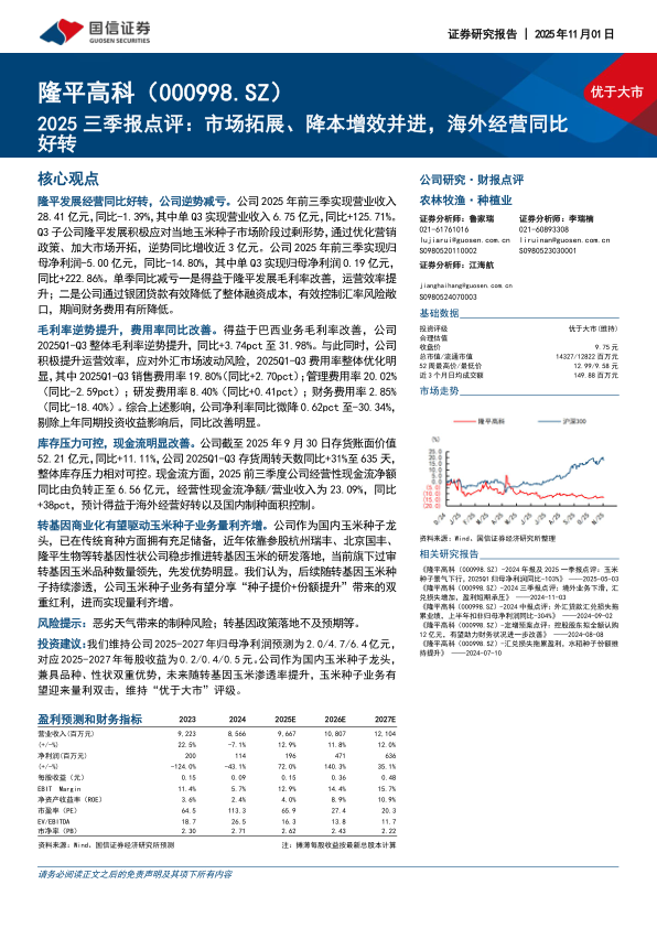 投资建议:我们维持公司2025-2027年归母净利润预测为2.0/4.7/6.4亿元,对应2025-2027年每股收益为0.2/0.4/0.5元。公司作为国内玉米种子龙头,兼具品种、性状双重优势,未来随转基因玉米渗透率提升,玉米种子业务有望迎来量利双击,维持“优于大市”评级。
