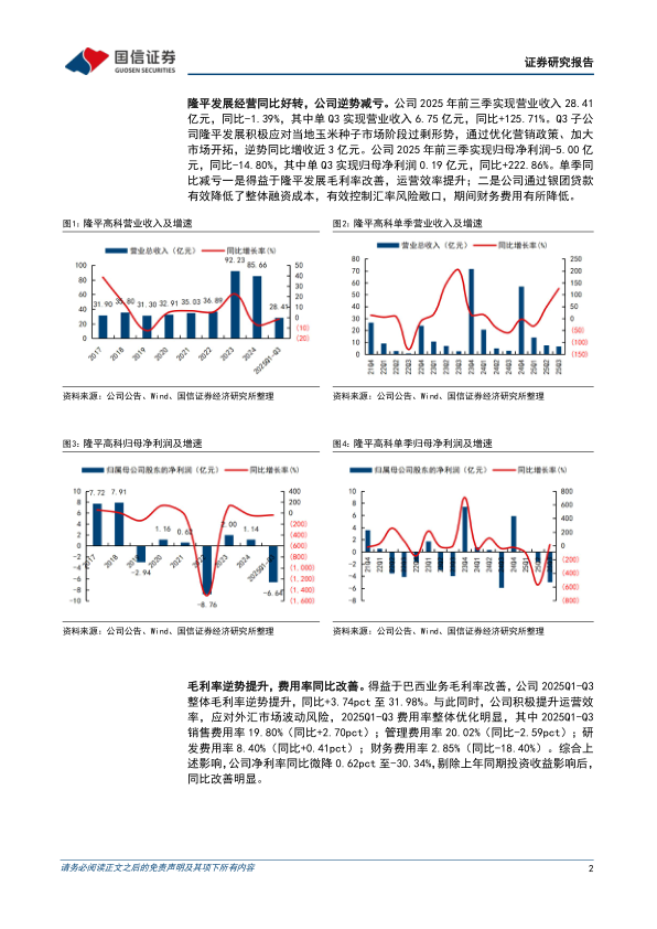 隆平发展经营同比好转,公司逆势减亏。公司2025年前三季实现营业收入28.41亿元,同比-1.39%,其中单Q3实现营业收入6.75亿元,同比+125.71%。Q3子公司隆平发展积极应对当地玉米种子市场阶段过剩形势,通过优化营销政策、加大市场开拓,逆势同比增收近3亿元。公司2025年前三季实现归母净利润-5.00亿元,同比-14.80%,其中单Q3实现归母净利润0.19亿元,同比+222.86%。单季同比减亏一是得益于隆平发展毛利率改善,运营效率提升;二是公司通过银团贷款有效降低了整体融资成本,有效控制汇率风险敞口,期间财务费用有所降低。
