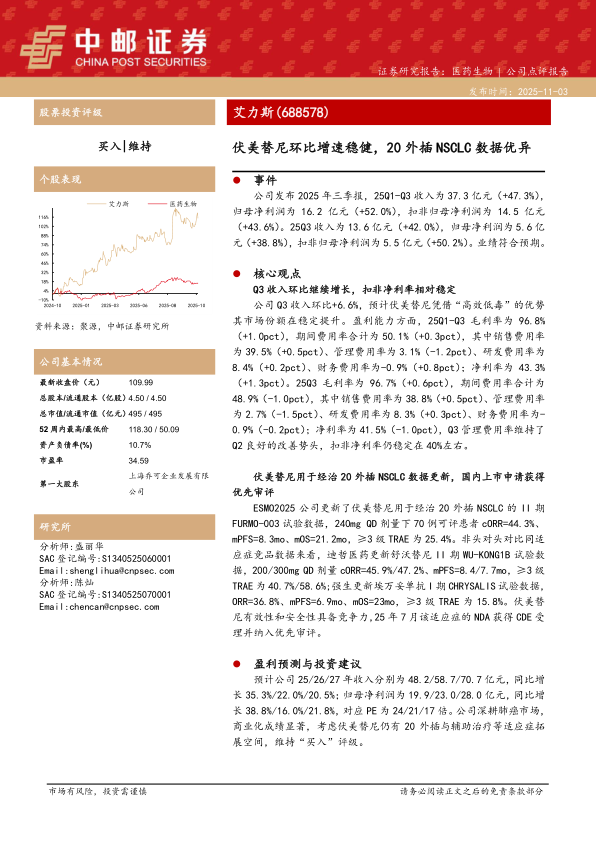 预计公司25/26/27年收入分别为48.2/58.7/70.7亿元,同比增长35.3%/22.0%/20.5%;归母净利润为19.9/23.0/28.0亿元,同比增长38.8%/16.0%/21.8%,对应PE为24/21/17倍。公司深耕肺癌市场商业化成绩显著,考虑伏美替尼仍有20外插与辅助治疗等适应症拓展空间,维持“买入”评级。