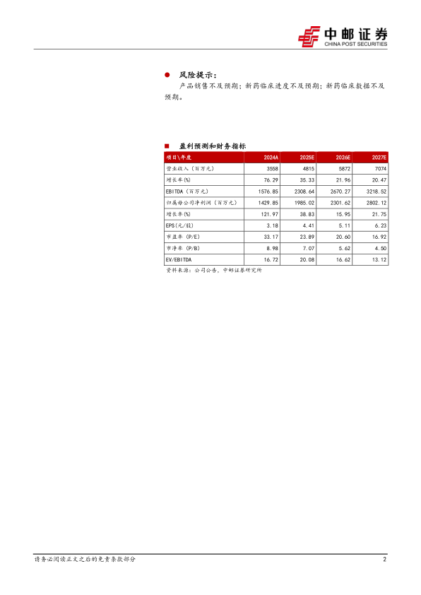 产品销售不及预期;新药临床进度不及预期;新药临床数据不及预期。