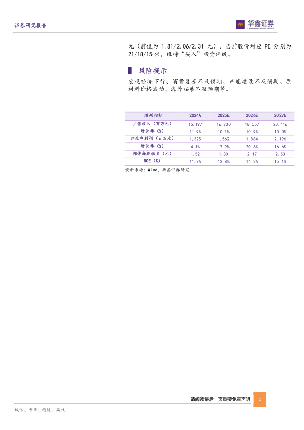 宏观经济下行、消费复苏不及预期、产能建设不及预期、原材料价格波动、海外拓展不及预期等。