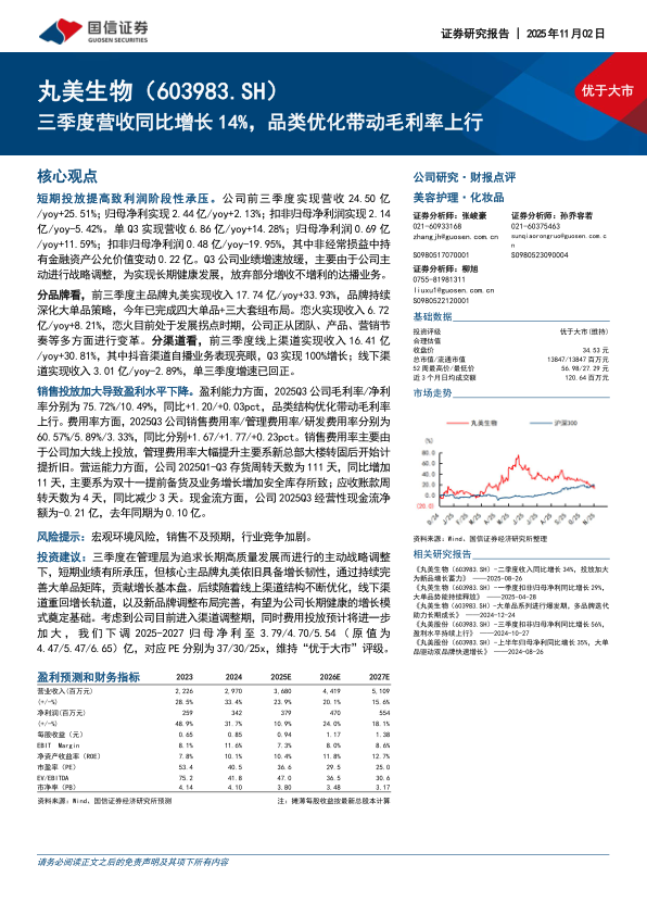 投资建议:三季度在管理层为追求长期高质量发展而进行的主动战略调整下,短期业绩有所承压,但核心主品牌丸美依旧具备增长韧性,通过持续完善大单品矩阵,贡献增长基本盘。后续随着线上渠道结构不断优化,线下渠道重回增长轨道,以及新品牌调整布局完善,有望为公司长期健康的增长模式奠定基础。考虑到公司目前进入渠道调整期,同时费用投放预计将进一步加大,我们下调2025-2027归母净利至3.79/4.70/5.54(原值为4.47/5.47/6.65)亿,对应PE分别为37/30/25x,维持“优于大市”评级。