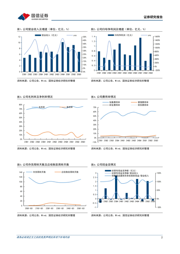 销售投放加大导致盈利水平下降。盈利能力方面,2025Q3公司毛利率/净利率分别为75.72%/10.49%,同比+1.20/+0.03pct,品类结构优化带动毛利率上行。费用率方面,2025Q3公司销售费用率/管理费用率/研发费用率分别为60.57%/5.89%/3.33%,同比分别+1.67/+1.77/+0.23pct。销售费用率主要由于公司加大线上投放,管理费用率大幅提升主要系新总部大楼转固后开始计提折旧。营运能力方面,公司2025Q1-Q3存货周转天数为111天,同比增加11天,主要系为双十一提前备货及业务增长增加安全库存所致;应收账款周转天数为4天,同比减少3天。现金流方面,公司2025Q3经营性现金流净额为-0.21亿,去年同期为0.10亿。