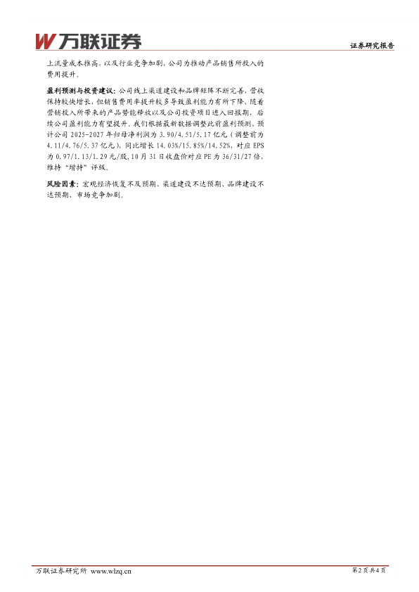 盈利预测与投资建议:公司线上渠道建设和品牌矩阵不断完善,营收保持较快增长,但销售费用率提升较多导致盈利能力有所下降,随着营销投入所带来的产品势能释放以及公司投资项目进入回报期,后续公司盈利能力有望提升。我们根据最新数据调整此前盈利预测,预计公司2025-2027年归母净利润为3.90/4.51/5.17亿元(调整前为4.11/4.76/5.37亿元),同比增长14.03%/15.85%/14.52%,对应EPS为0.97/1.13/1.29元/股,10月31日收盘价对应PE为36/31/27倍,维持“增持”评级。