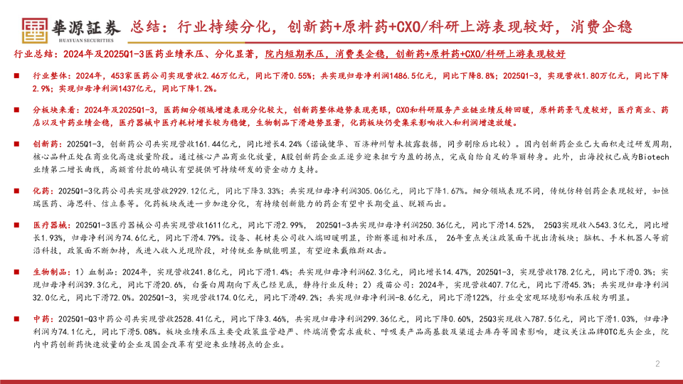 分板块来看:2024年及2025Q1-3,医药细分领域增速表现分化较大,创新药整体趋势表现亮眼,CXO和科研服务产业链业绩反转回暖,原料药景气度较好,医疗商业、药店以及中药业绩企稳,医疗器械中医疗耗材增长较为稳健,生物制品下滑趋势显著,化药板块仍受集采影响收入和利润增速放缓。