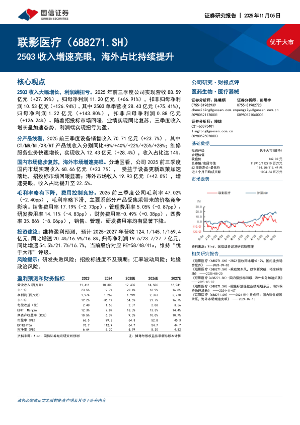 分产品线看,2025前三季度设备销售收入70.71亿元(+23.7%),其中CT/MR/MI/XR/RT产品线收入分别同比+8%/+40%/+22%/+25%/+28%;维修服务业务快速增长,实现收入12.43亿元(+28.4%),收入占比达14%。国内市场稳步复苏,海外市场增速亮眼。分地区看,公司2025前三季度