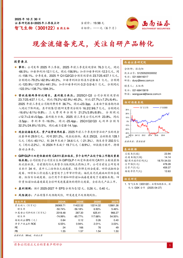 营收连续两季环比增长,盈利能力承压。 2025Q1-Q3 公司分别实现营收23.7/25.4/27.1亿元,同比-79.2%/-62.9%/-40.2%,环比-27.7%/+7.2%/6.4%。2025 年前三季度公司期间费用率 36.7%,同比+23.3pp, 主要由于报告期内收入同比下降所致。 其中销售/管理/研发费用分别为 16.2/2.9/6.7 亿元,分别同比-16.6%/-8.1%/-9.8% ;三 大费用 率分别 为 21.2%/3.8%/8.8% ,分 别同 比+12.7/+2.4/+5.5pp。 盈利能力方面, 2025 前三季度公司毛利率 23.8%,同比-3.5pp; 净 利率 为 -16.0% ,同 比 -25.4pp。 25Q1/Q2/Q3 毛 利率 分别 为32.2%/24.8%/15.5%,同比+6.1/-2.8/-14.1pp。