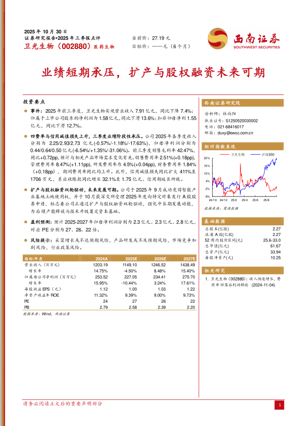 事件: 2025年前三季度,卫光生物实现营业收入 ] 7.91亿元,同比下降 7.4%;归属于上市公司股东的净利润为 1.58亿元,同比下滑13.6%;扣非归母净利1.55亿元,同比下滑 12.7%。