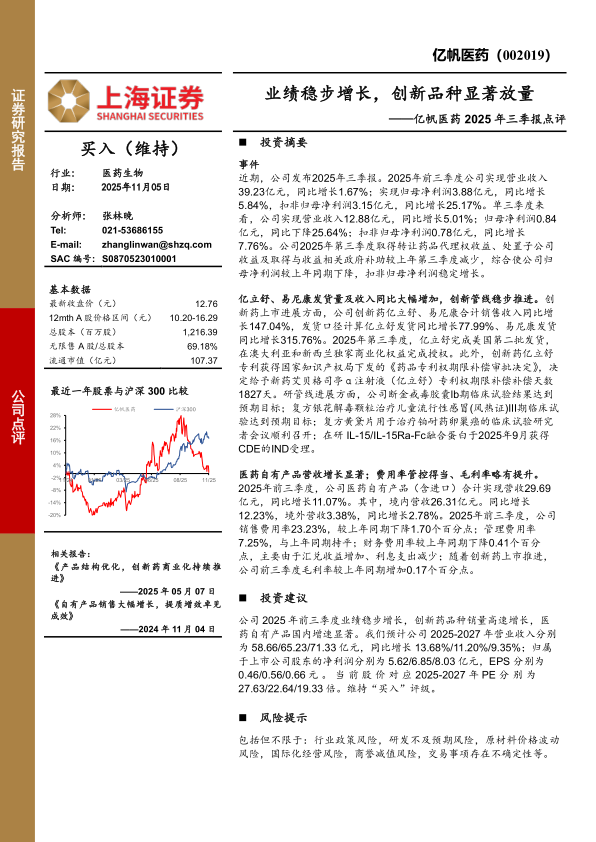 公司2025年前三季度业绩稳步增长,创新药品种销量高速增长,医药自有产品国内增速显著。我们预计公司2025-2027年营业收入分别为58.66/65.23/71.33亿元,同比增长13.68%/11.20%/9.35%;归属于上市公司股东的净利润分别为5.62/6.85/8.03亿元,EPS分别为0.46/0.56/0.66元。当前股价对应2025-2027年PE分别为27.63/22.64/19.33倍。维持“买入”评级。