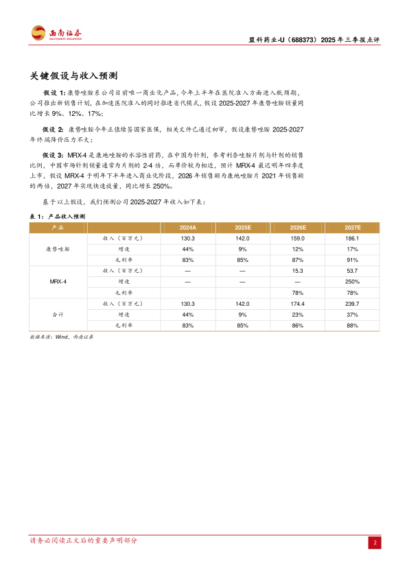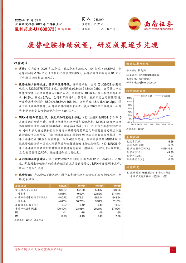 盈利预测与投资建议。预计2025-2027年EPS分别为-0.42元、-0.40元、-0.37元。考虑到康替唑胺片的临床价值突出且具备出海潜力,MRX-4有望明年上市,维持“买入”评级。