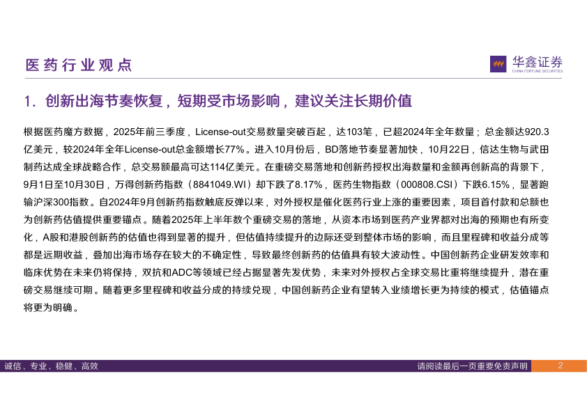 根据医药魔方数据,2025年前三季度,License-out交易数量突破百起,达103笔,已超2024年全年数量;总金额达920.3亿美元,较2024年全年License-out总金额增长77%。进入10月份后,BD落地节奏显著加快,10月22日,信达生物与武田制药达成全球战略合作,总交易额最高可达114亿美元。在重磅交易落地和创新药授权出海数量和金额再创新高的背景下,9月1日至10月30日,万得创新药指数(8841049.WI)却下跌了8.17%,医药生物指数(000808.CSI)下跌6.15%,显著跑输沪深300指数。自2024年9月创新药指数触底反弹以来,对外授权是催化医药行业上涨的重要因素,项目首付款和总额也为创新药估值提供重要锚点。随着2025年上半年数个重磅交易的落地,从资本市场到医药产业界都对出海的预期也有所变化,A股和港股创新药的估值也得到显著的提升,但估值持续提升的边际还受到整体市场的影响,而且里程碑和收益分成等都是远期收益,叠加出海市场存在较大的不确定性,导致最终创新药的估值具有较大波动性。中国创新药企业研发效率和临床优势在未来仍将保持,双抗和ADC等领域已经占据显著先发优势,未来对外授权占全球交易比重将继续提升,潜在重磅交易继续可期。随着更多里程碑和收益分成的持续兑现,中国创新药企业有望转入业绩增长更为持续的模式,估值锚点将更为明确。