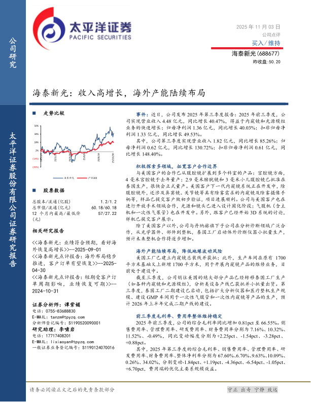 事件:近日,公司发布2025年第三季度报告:2025年前三季度,公司实现营业收入4.48亿元,同比增长40.47%,得益于内窥镜和光源模组业务的快速增长;归母净利润1.36亿元,同比增长40.03%;扣非归母净利润1.33亿元,同比增长49.53%。