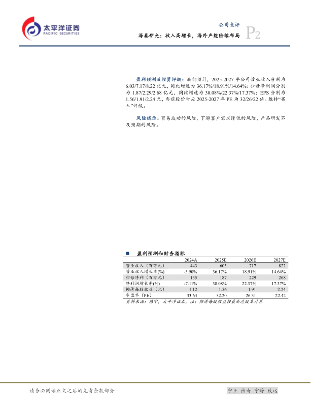 盈利预测及投资评级:我们预计,2025-2027年公司营业收入分别为6.03/7.17/8.22亿元,同比增速为36.17%/18.91%/14.64%;归母净利润分别为1.87/2.29/2.68亿元,同比增速为38.08%/22.37%/17.37%;EPS分别为1.56/1.91/2.24元,当前股价对应2025-2027年PE为32/26/22倍。维持“买入”评级。