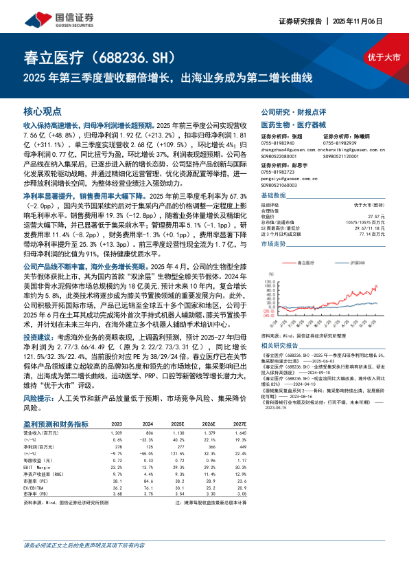 投资建议:考虑海外业务的亮眼表现,上调盈利预测,预计2025-27年归母净利润为2.77/3.66/4.49亿(原为2.22/2.73/3.31亿),同比增长121.5%/32.3%/22.4%,当前股价对应PE为38/29/24倍。春立医疗已在关节假体产品领域建立起较高的品牌知名度和领先的市场地位,集采影响已出清,出海成为第二增长曲线,运动医学、PRP、口腔等新管线等增长潜力大,维持“优于大市”评级。