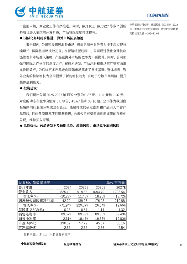 我们预计公司2025-2027年EPS分别为0.87元、1.11元和1.32元,对应的动态市盈率分别为57.79倍、45.67倍和38.16倍。公司作为我国血凝酶制剂行业细分领域龙头企业,通过持续的研发创新和产品引入丰富产品管线,目前各项研发项目顺利推进,未来公司有望迎来创新成果的多样化兑现,维持买入评级。