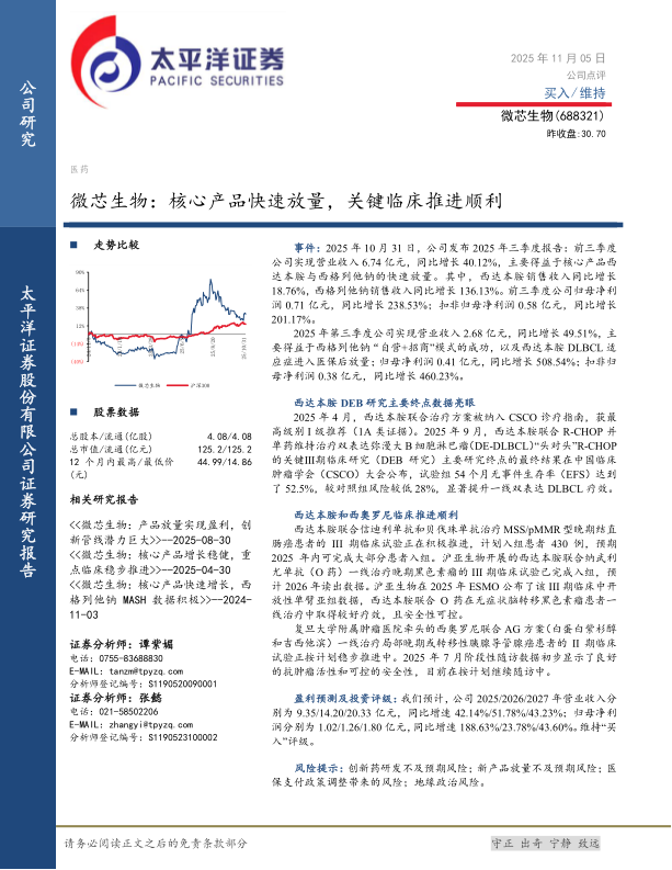 2025年第三季度公司实现营业收入2.68亿元,同比增长49.51%,主要得益于西格列他钠“自营+招商”模式的成功,以及西达本胺DLBCL适应症进入医保后放量;归母净利润0.41亿元,同比增长508.54%;扣非归母净利润0.38亿元,同比增长460.23%。
