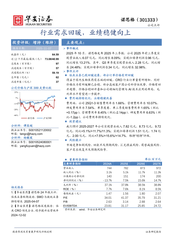 得益于国内生物医药需求端的回暖,CRO行业订单量有所增加,同时价格压力有所缓解已企稳,部分高端客户因公司科学性优势,价格有回升趋势。价格企稳回升叠加公司精细化管理与AI技术应用的布局,毛利率水平有望进一步提升。