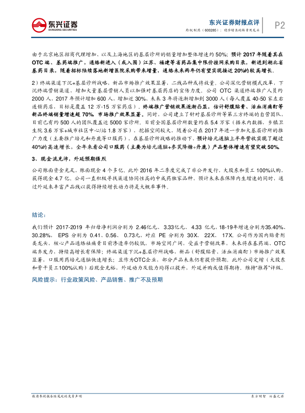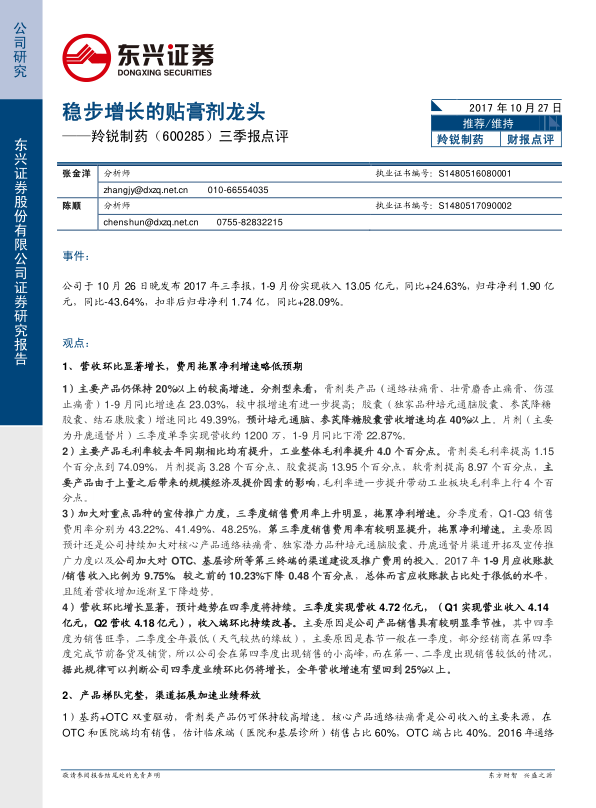 三季报点评:稳步增长的贴膏剂龙头
