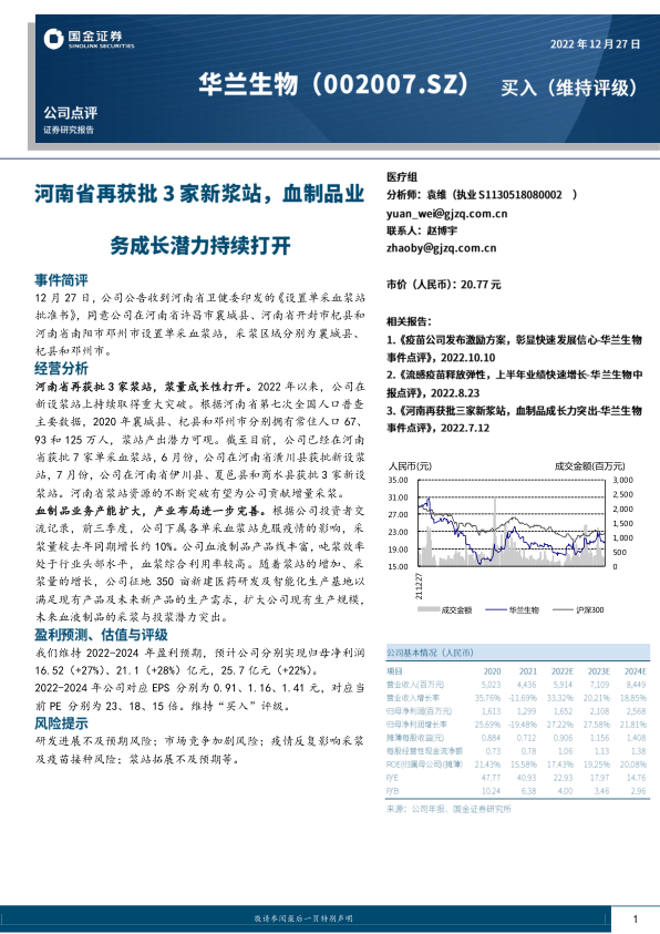 研发进展不及预期风险;市场竞争加剧风险;疫情反复影响采浆及疫苗接种风险;浆站拓展不及预期等。