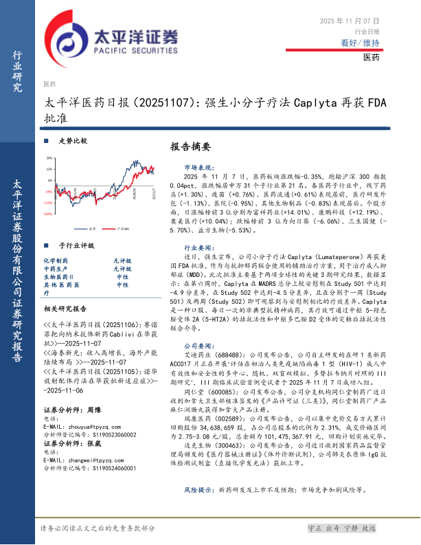 2025年11月7日,医药板块涨跌幅-0.35%,跑输沪深300指数0.04pct,涨跌幅居申万31个子行业第21名。各医药子行业中,线下药店(+1.30%)、疫苗(+0.76%)、医药流通(+0.61%)表现居前,医疗研发外包(-1.13%)、医院(-0.95%)、其他生物制品(-0.83%)表现居后。个股方面,日涨幅榜前3位分别为富祥药业(+14.01%)、康鹏科技(+12.19%)、奥美医疗(+10.04%);跌幅榜前3位为向日葵(-6.06%)、三生国健(-5.70%)、益方生物(-5.53%)。