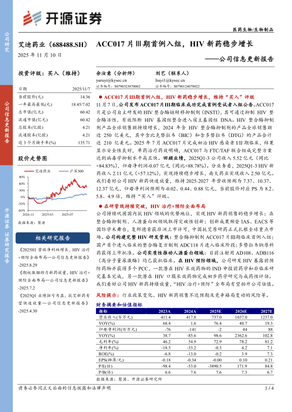 14.36 ACC017片Ⅲ期首例入组,HIV新药稳步增长,维持“买入”评级18.45/7.0211月7日,公司发布ACC017片Ⅲ期临床成功完成首例受试者入组公告。ACC01760.42片是公司自主研发的HIV整合酶链转移抑制剂(INSTI),其可通过抑制HIV整60.42合酶活性,有效阻断HIV基因组整合进入宿主基因组DNA。HIV整合酶抑制4.21剂产品全球销售额持续增长,2024年含HIV整合酶抑制剂的产品全球销售额4.21近250亿美元,其中含比克替拉韦(BIC)和含多替拉韦(DTG)的产品合计135.71近210亿美元。2025年7月ACC017片完成初治HIV感染者I/II期临床,结果显示安全性良好,单药治疗药效明确,ACC017与FTC/TAF联合组成完整方案达到病毒学抑制水平高且快。回顾业绩,2025Q1-3公司收入5.52亿元(同比+84.83%),归母净利润-0.07亿元(同比+88.78%)。分业务看,2025Q1-3HIV新药收入2.11亿元(+57.12%),实现持续稳步增长,南大药业实现收入2.50亿元。我们看好公司HIV新药快速放量,维持2025-2027年营收预测为7.37、10.37、12.37亿元,归母净利润预测为-0.02、0.44、0.88亿元,当前股价对应PS为8.2、5.8、4.9倍,维持“买入”评级。