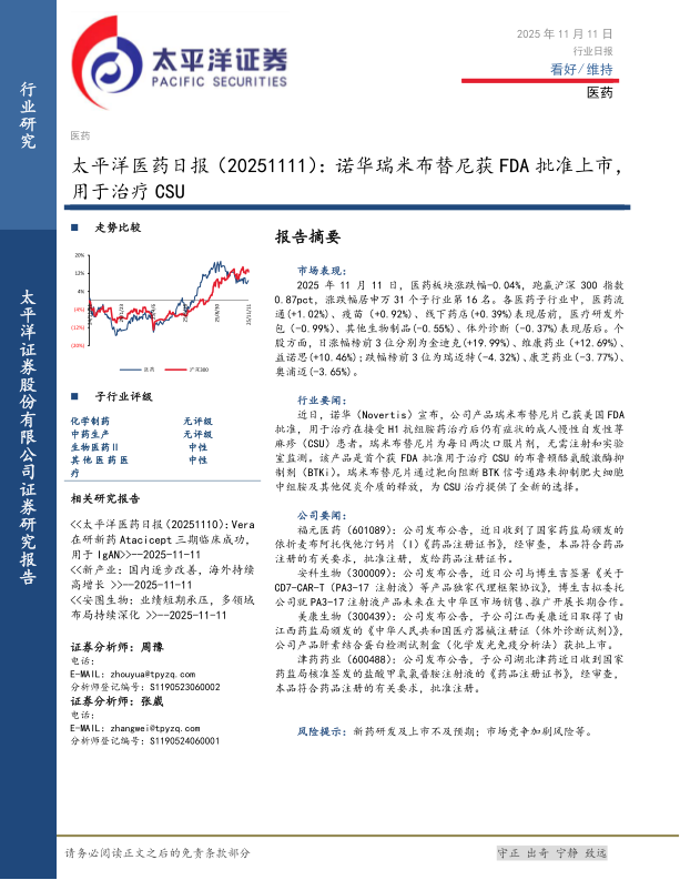 2025年11月11日,医药板块涨跌幅-0.04%,跑赢沪深300指数0.87pct,涨跌幅居申万31个子行业第16名。各医药子行业中,医药流通(+1.02%)、疫苗(+0.92%)、线下药店(+0.39%)表现居前,医疗研发外包(-0.99%)、其他生物制品(-0.55%)、体外诊断(-0.37%)表现居后。个股方面,日涨幅榜前3位分别为金迪克(+19.99%)、维康药业(+12.69%)、益诺思(+10.46%);跌幅榜前3位为瑞迈特(-4.32%)、康芝药业(-3.77%)、奥浦迈(-3.65%)。