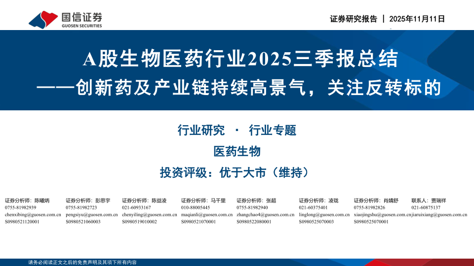 A股生物医药行业2025三季报总结:创新药及产业链持续高景气,关注反转标的