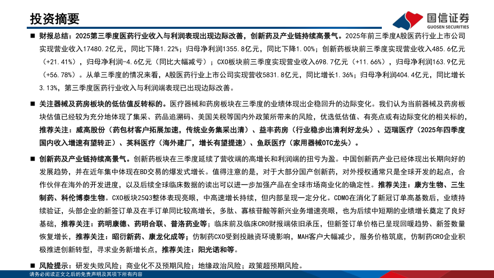 创新药及产业链持续高景气。创新药板块在三季度延续了营收端的高增长和利润端的扭亏为盈。中国创新药产业已经体现出长期向好的发展趋势,并在近年集中体现在BD交易的爆发式增长。值得注意的是,对于大部分国产创新药,对外授权通常只是全球开发的起点,合作伙伴在海外的开发进度,以及后续全球临床数据的读出可以进一步加强产品在全球市场商业化的确定性。推荐关注:康方生物、三生制药、科伦博泰生物。CXO板块25Q3整体表现亮眼,中高速增长持续,但内部呈现一定分化。CDMO在消化了新冠订单高基数后,业绩持续验证,头部企业的新签订单及在手订单同比较高增长,多肽、寡核苷酸等新兴业务增速亮眼,也为后续中短期的业绩增长奠定了良好基础,推荐关注:药明康德、药明合联、普洛药业等;临床前及临床CRO财报端依旧承压,但新签订单价格已呈现回暖趋势、新签数量恢复增长,推荐关注:昭衍新药、康龙化成等;仿制药CXO受到投融资环境影响,MAH客户大幅减少,服务价格筑底,仿制药CRO企业积极推进创新转型,寻求业务新增长点,推荐关注:阳光诺和等。