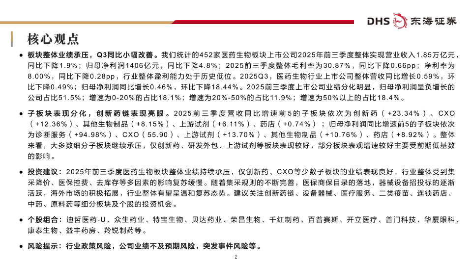 投资建议:2025年前三季度医药生物板块整体业绩持续承压,仅创新药、CXO等少数子板块的业绩表现良好,行业整体受到集采降价、医保控费、去库存等多因素的影响复苏缓慢。随着集采规则的不断完善,医保商保目录的落地,器械设备招投标的逐渐活跃,海外市场的积极拓展,行业整体有望呈温和复苏态势。建议关注创新药链、设备器械、医疗服务、二类疫苗、连锁药店、中药、原料药等细分板块及个股的投资机会。