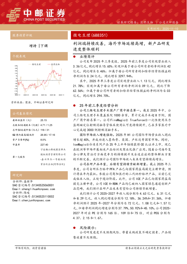 公司在研产品丰富,后续有望持续贡献新增量。截止2025年三季度,公司自研压力脉冲PFA产品已向国家药监局提交注册申请,预计将在年内获批。参股公司商阳医疗的二代纳秒脉冲产品,目前已完成临床入组,正处于随访阶段。此外,公司ICE产品已向国家药监局提交注册申请,公司ICE和RDN产品均已被纳入国家绿色通道创新产品范畴,我们预计在研产品未来有望给公司持续贡献增量。