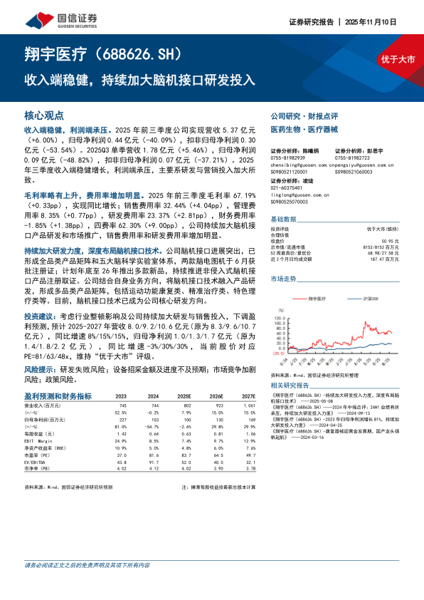 毛利率略有上升,费用率增加明显。2025年前三季度毛利率67.19%(+0.33pp),实现同比增长;销售费用率32.44%(+4.04pp),管理费用率8.35%(+0.77pp),研发费用率23.37%(+2.81pp),财务费用率-1.85%(+1.38pp),四费率62.30%(+9.00pp),公司持续加大脑机接口产品研发和市场推广,销售费用率和研发费用率增加明显。