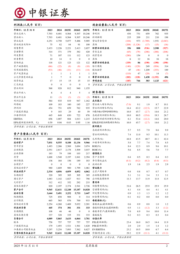 研发持续投入,在研项目稳步推进。公司前三季度实现研发费用0.73亿元,同比增长5.06%,持续在心脑血管、骨科、抗肿瘤等治疗领域布局,25年前三季度,公司治疗缺血性脑卒中的天然药1类新药KYAZ01-2011-020有序推进II期临床治疗非酒精性脂肪肝的化药1类新药KYAH01-2018-111、治疗实体瘤的化药1类新药KYAH01-2016-079正在开展临床I期;化药2类改良型新药232正在进行临床研究的前期准备。其他仿制药项目等也在积极推进。