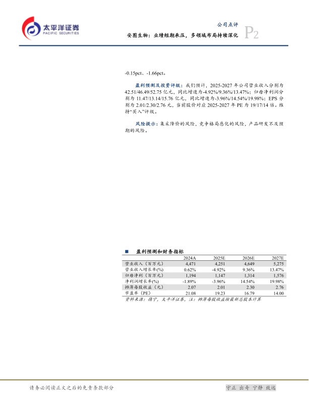 盈利预测及投资评级:我们预计,2025-2027年公司营业收入分别为42.51/46.49/52.75亿元,同比增速为-4.92%/9.36%/13.47%;归母净利润分别为11.47/13.14/15.76亿元,同比增速为-3.96%/14.54%/19.98%;EPS分别为2.01/2.30/2.76元,当前股价对应2025-2027年PE为19/17/14倍。维持“买入”评级。