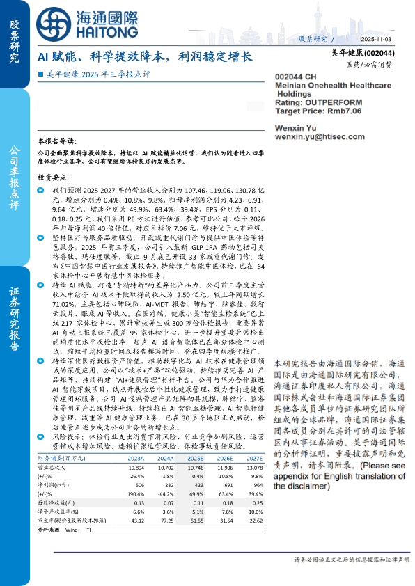 公司全面聚焦科学提效降本,持续以AI赋能精益化运营,我们认为随着进入四季度体检行业旺季,公司有望继续保持良好的发展态势。