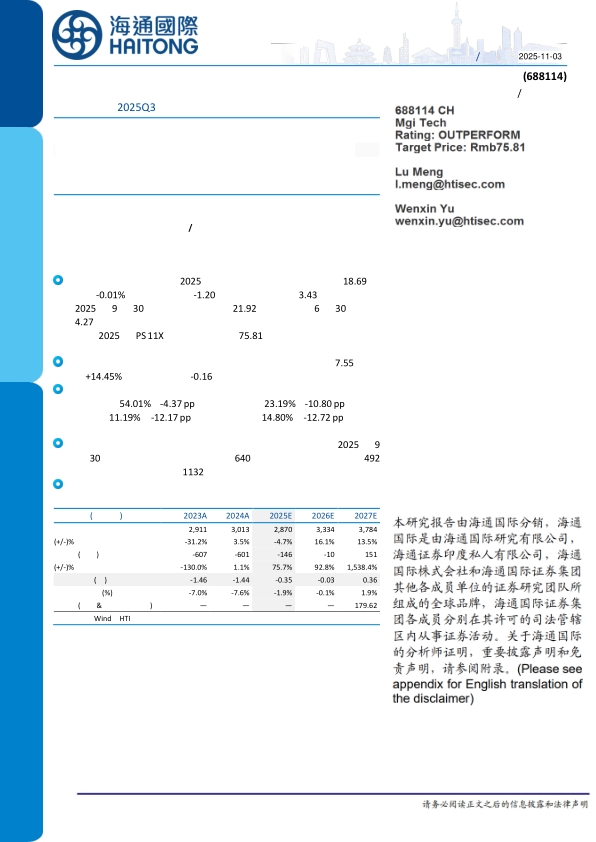 维持评级为增持评级。2025年前三季度公司实现收入营收18.69亿元(-0.01%),归母净利润-1.20亿元(同比减亏3.43亿元),截至2025年9月30日,公司货币资金21.92亿元(环比6月30日减少4.27亿元)。考虑到公司的主业增长稳健,结合可比公司估值,给予公司2025年PS11X,对应目标价为75.81元,维持评级为优于大市评级。
