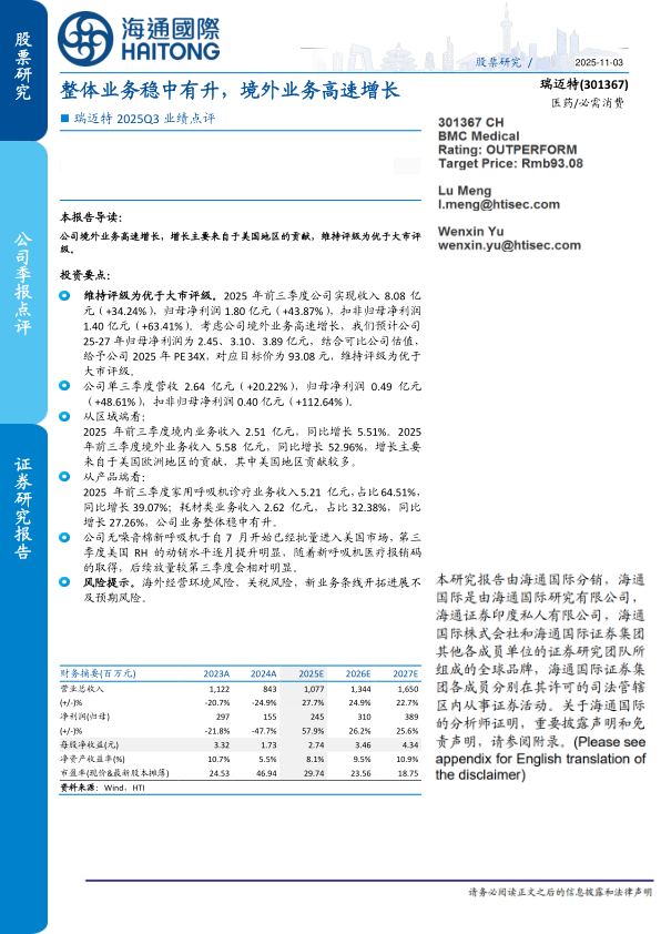 维持评级为优于大市评级。2025年前三季度公司实现收入8.08亿元(+34.24%),归母净利润1.80亿元(+43.87%),扣非归母净利润1.40亿元(+63.41%)。考虑公司境外业务高速增长,我们预计公司25-27年归母净利润为2.45、3.10、3.89亿元,结合可比公司估值,给予公司2025年PE34X,对应目标价为93.08元,维持评级为优于大市评级。